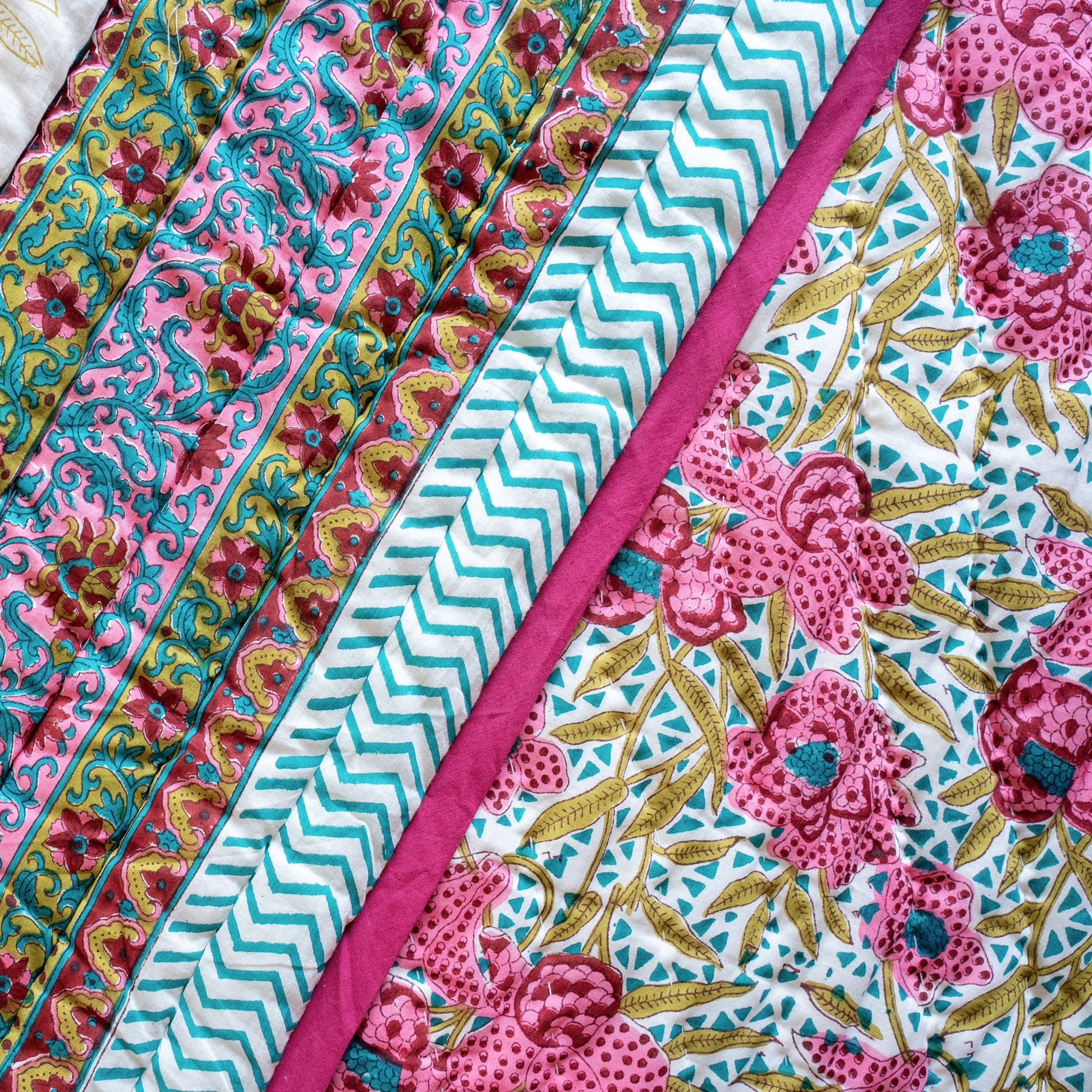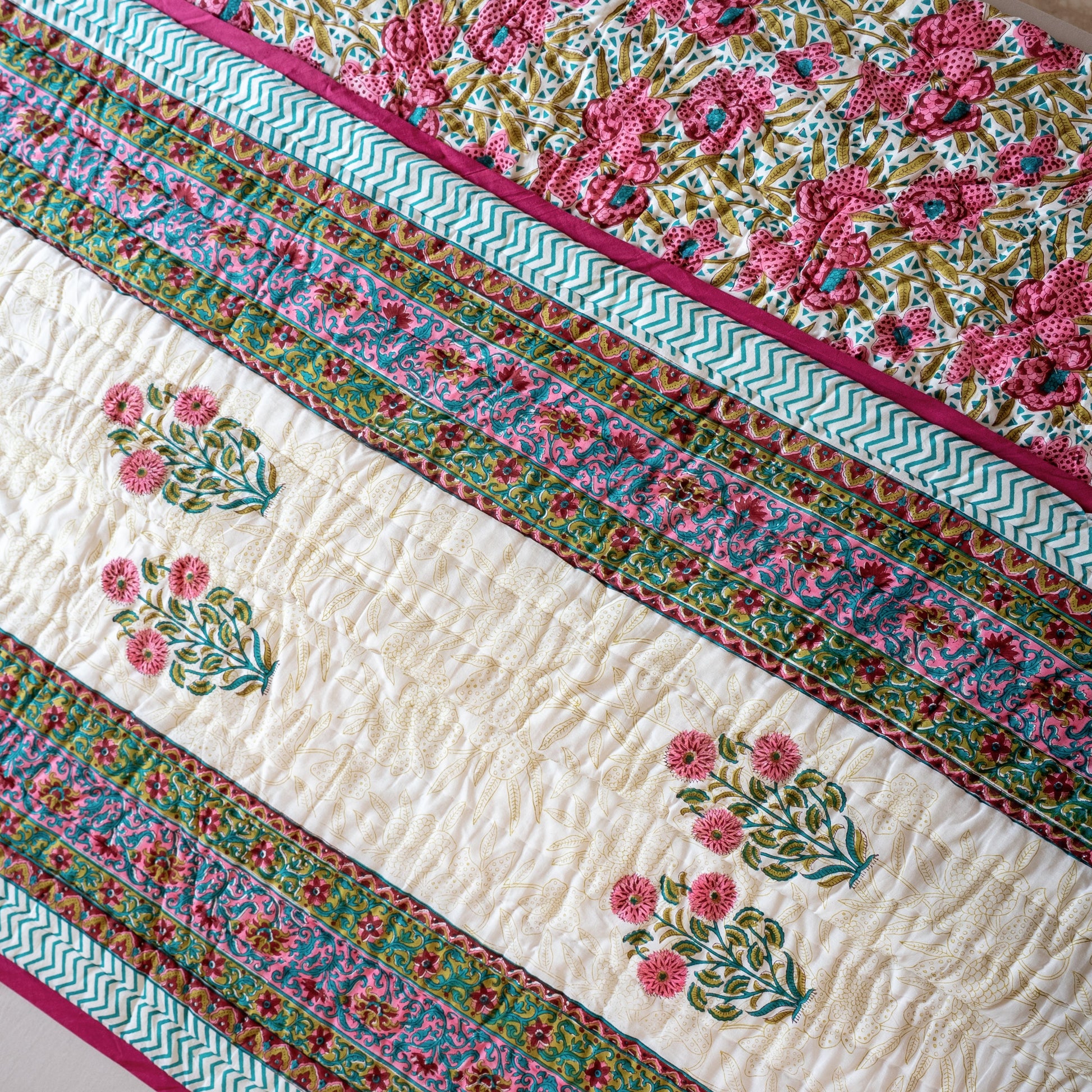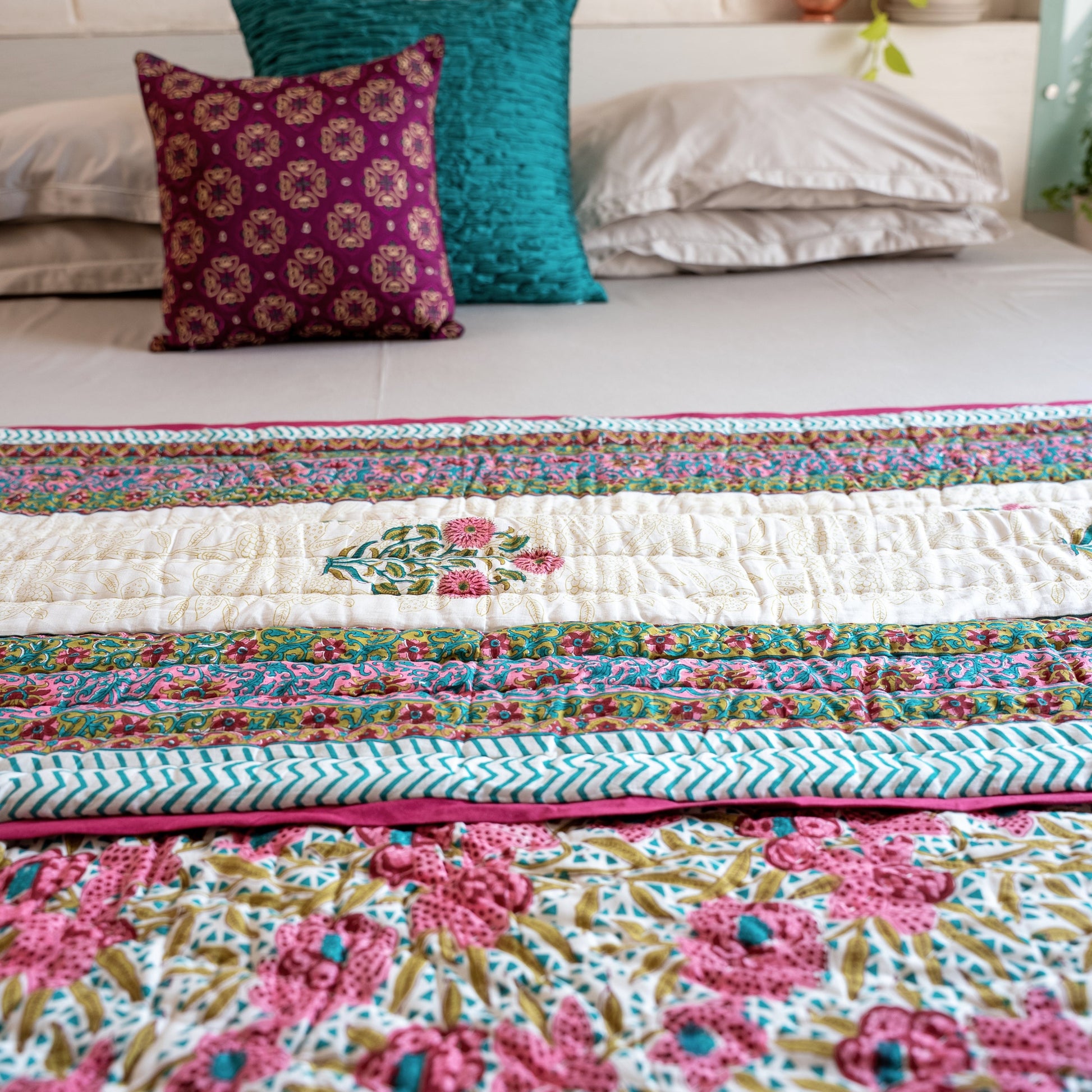 Bring timeless elegance Ruby Garden Dohar to your bedroom with this hand-block-printed, reversible quilt featuring delicate motifs in soothing tones. Made from cloud-soft cotton, it’s gentle on the skin and beautifully breathable—giving you comfort that makes you never want to leave the bed. With different prints on each side and fully home-washable care, it’s perfect for effortless, year-round use.