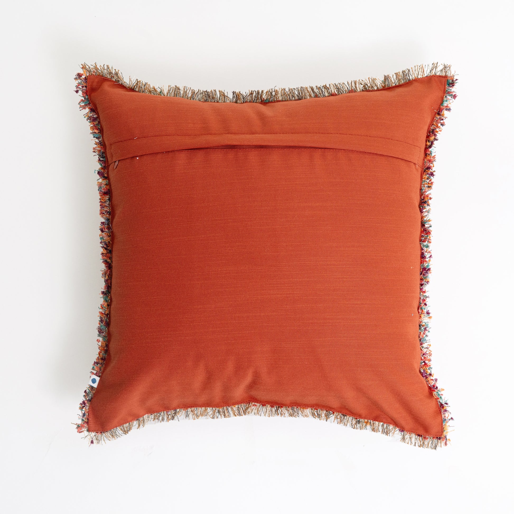The Aurelia Cushion – Jewel Tones celebrates vibrancy with emerald green, purple, pink, rust, and mustard woven together with a touch of metallic. Handwoven with multiple yarns, it creates a lively, textured surface full of dimension. The playful mix of colors makes it a striking accent that coordinates easily with solids, florals, geometrics, or contemporary designs.