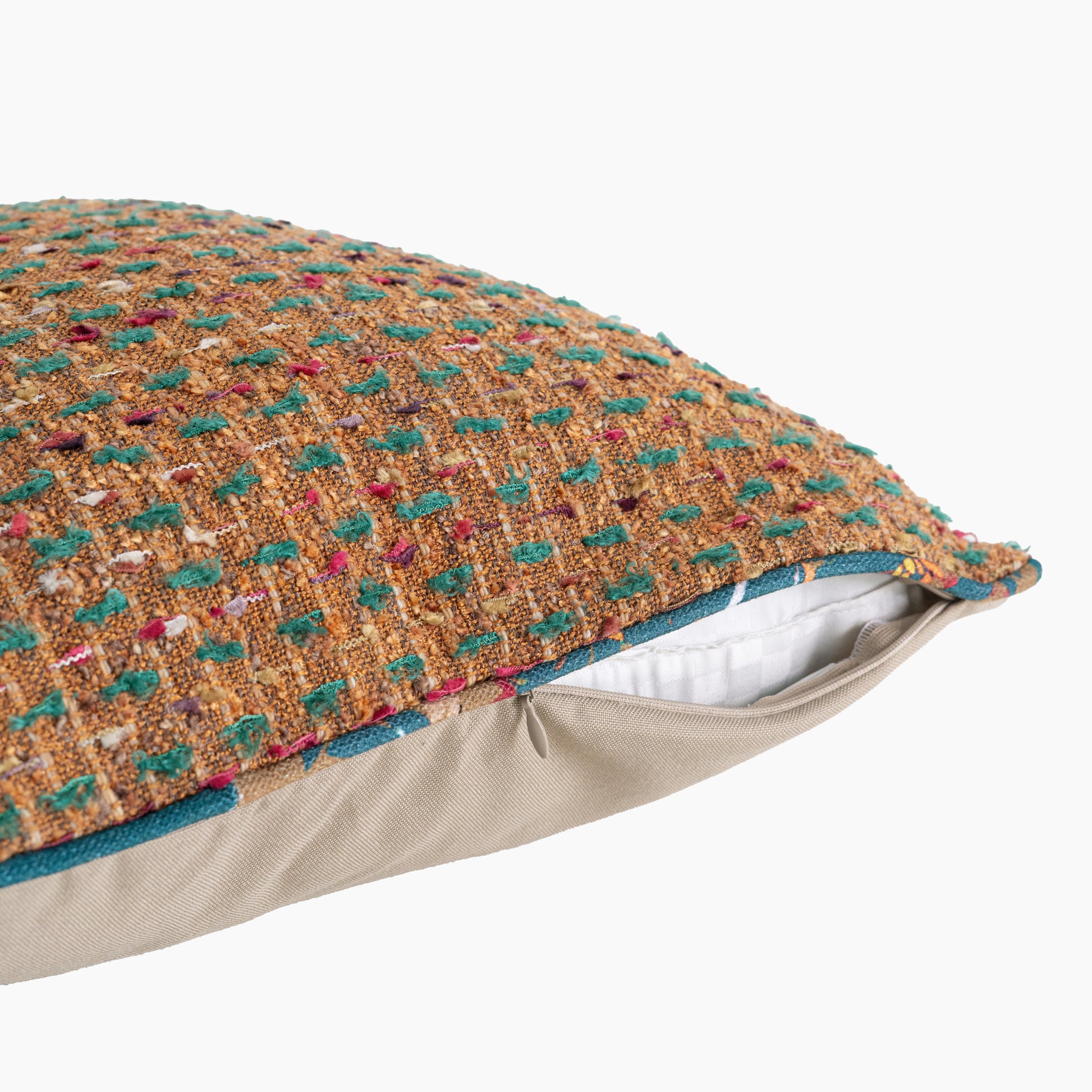 The Eira Jewel Feather Cushion combines a rust-toned base with a playful dash of emerald green feather yarns. Handwoven with tactile detail, it strikes a balance between richness and texture. The emerald accents give it a celebratory vibrance, making it an eye-catching piece that still coordinates easily with earthy neutrals, jewel tones, or patterned companions.