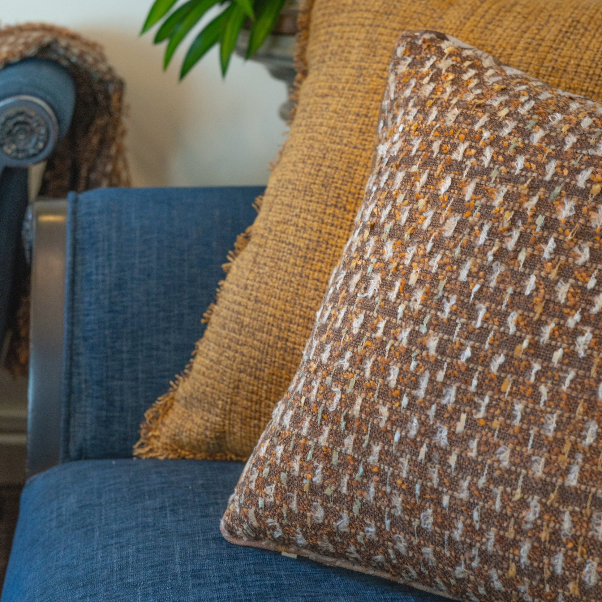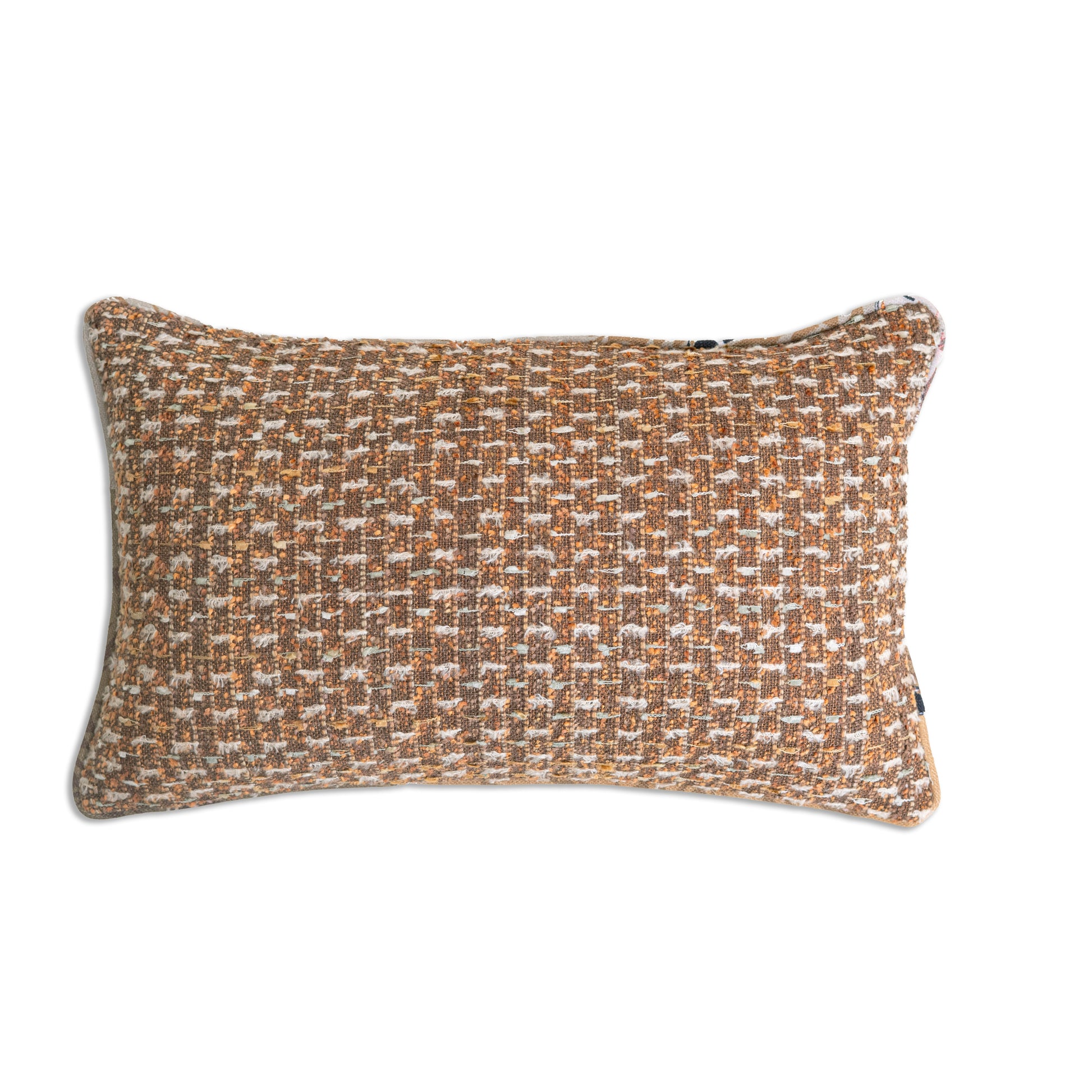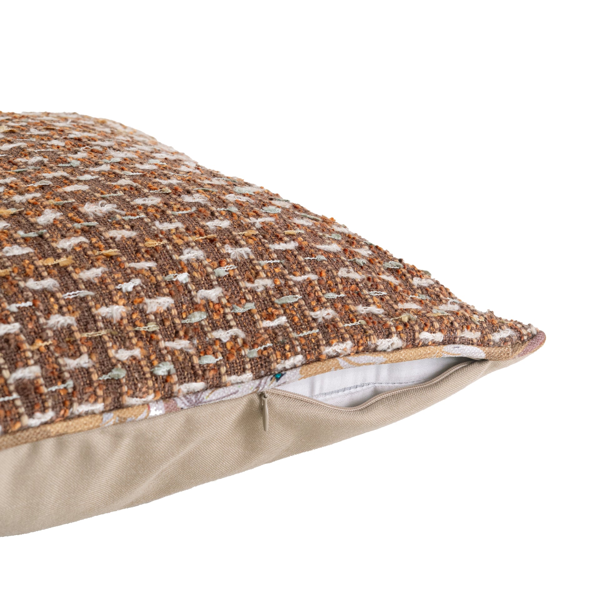 The Eira Sand Feather Cushion is handwoven with a subtle textured base in sandy rust tones, layered with feather-like cream yarns that add softness and dimension. The neutral palette makes it versatile, while the feathered detail introduces a gentle 3D lift — perfect for pairing with solids, prints, or other textural accents.