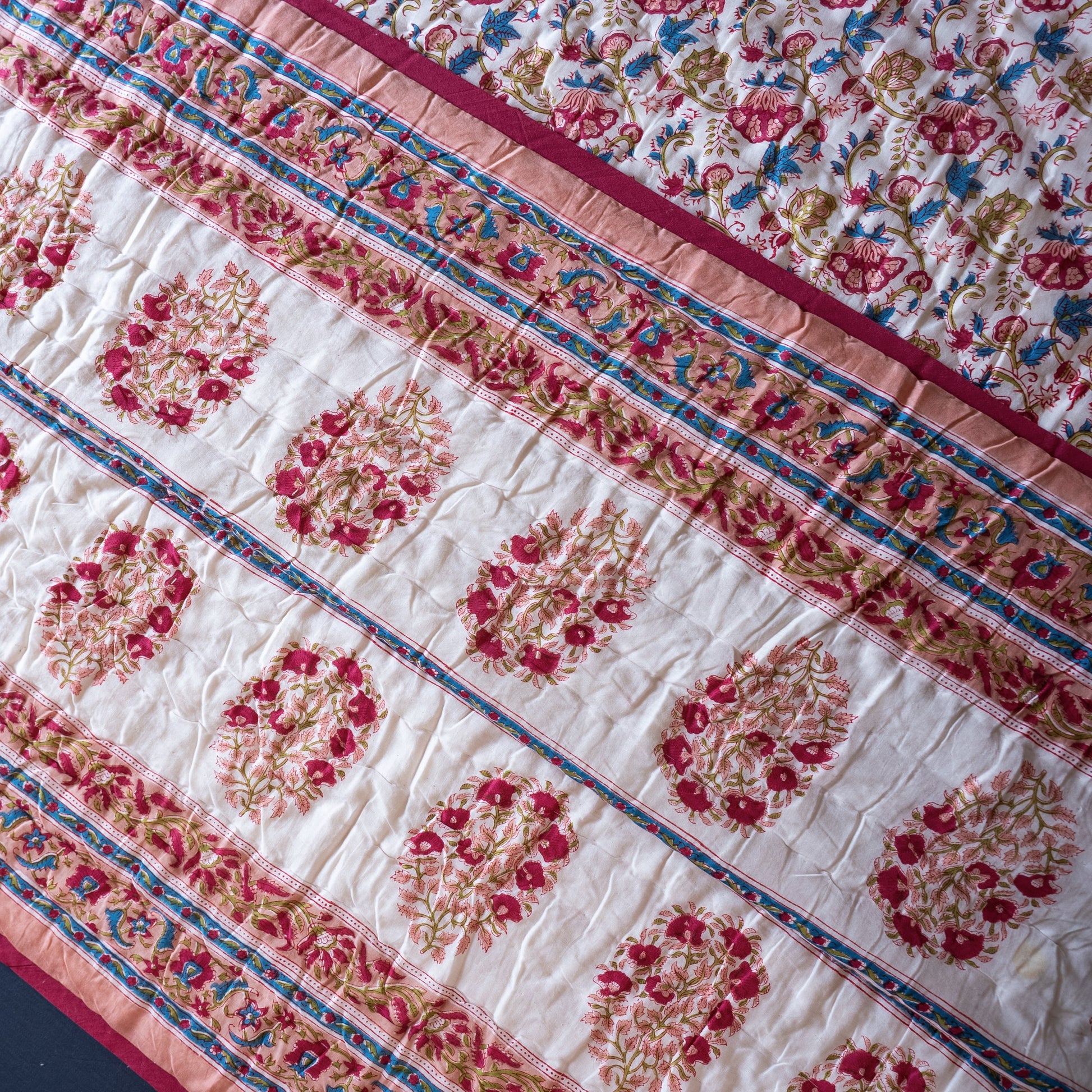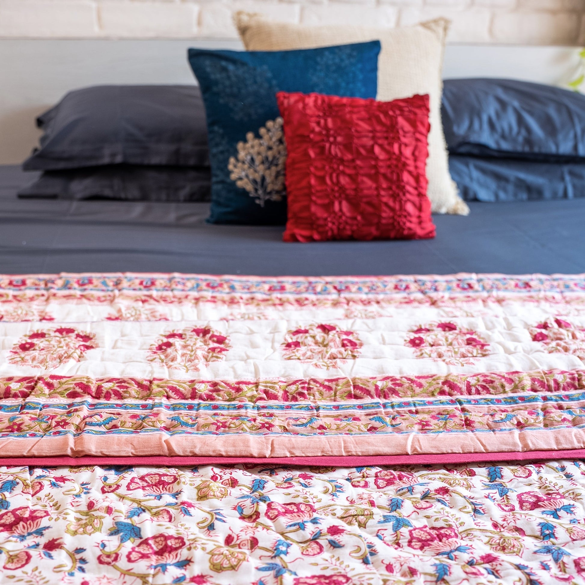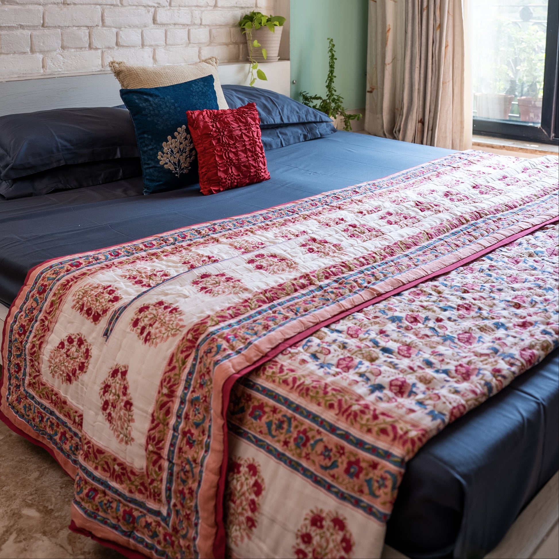 Bring timeless elegance Gulaabi Baagh Dohar, to your bedroom with this hand-block-printed, reversible quilt featuring delicate motifs in soothing tones. Made from cloud-soft cotton, it’s gentle on the skin and beautifully breathable—giving you comfort that makes you never want to leave the bed. With different prints on each side and fully home-washable care, it’s perfect for effortless, year-round use.