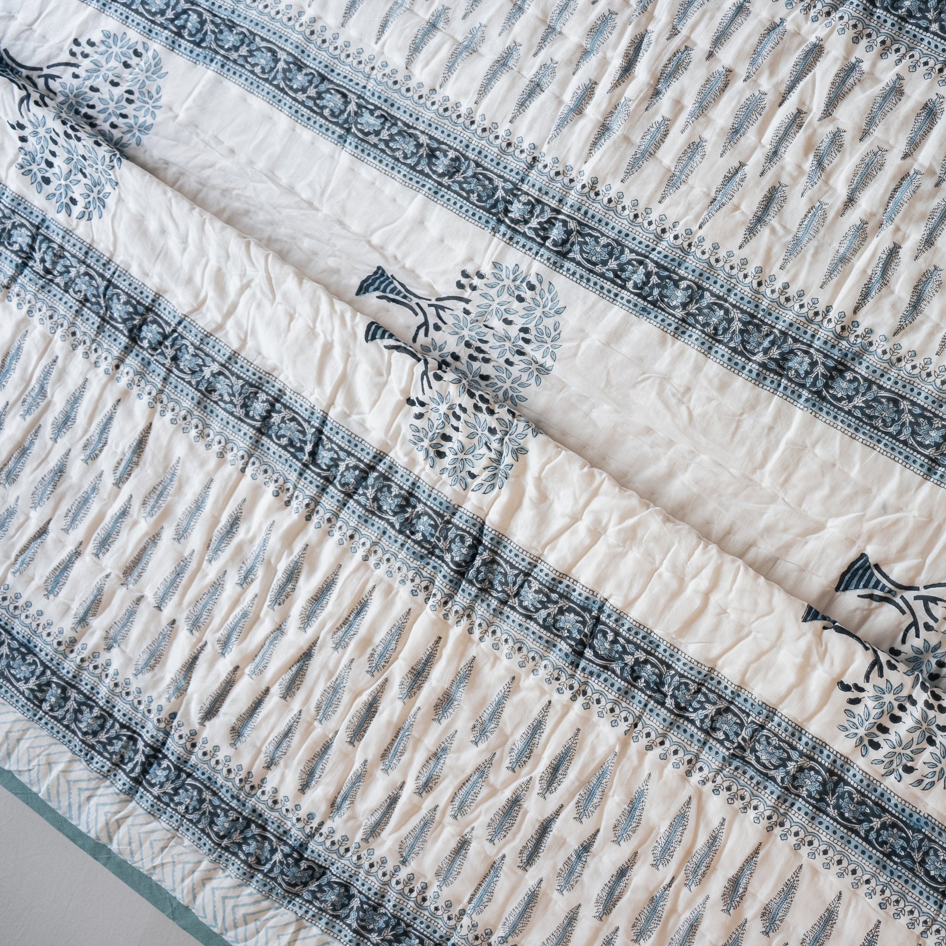 Bring timeless elegance Grey Ivory Blossom Dohar, to your bedroom with this hand-block-printed, reversible quilt featuring delicate motifs in soothing tones. Made from cloud-soft cotton, it’s gentle on the skin and beautifully breathable—giving you comfort that makes you never want to leave the bed. With different prints on each side and fully home-washable care, it’s perfect for effortless, year-round use.