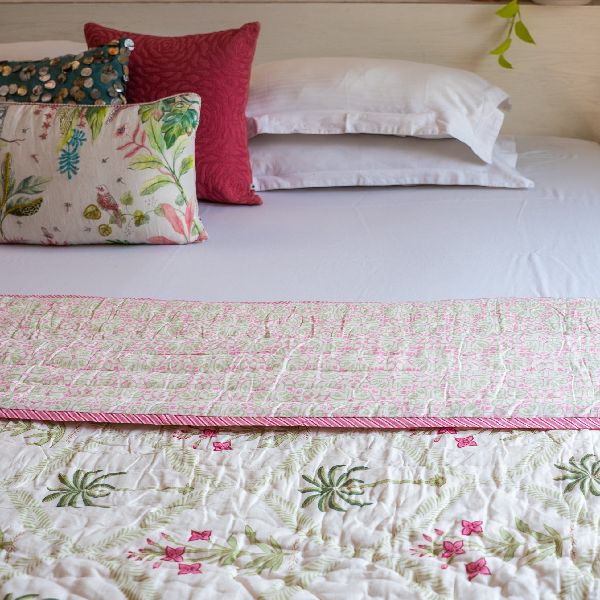 Bring timeless elegance Ruby Orchard Dohar, to your bedroom with this hand-block-printed, reversible quilt featuring delicate motifs in soothing tones. Made from cloud-soft cotton, it’s gentle on the skin and beautifully breathable—giving you comfort that makes you never want to leave the bed. With different prints on each side and fully home-washable care, it’s perfect for effortless, year-round use.