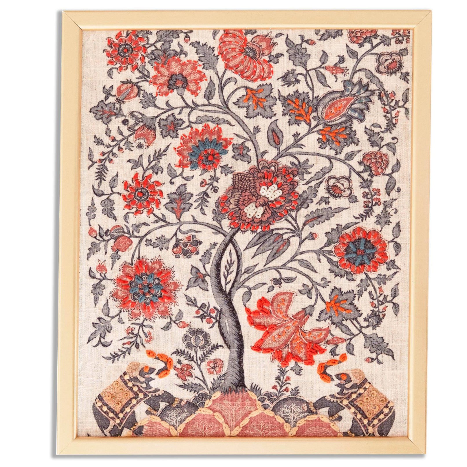 This hand-drawn, printed, and delicately hand-embroidered wall art captures the timeless elegance with a majestic tree motif surrounded by intricate floral patterns and adorned elephants. The blend of earthy tones and fine embroidery brings out a story of prosperity, strength, and cultural richness. A perfect fusion of tradition and contemporary artistry, it brightens any home while carrying the spirit of heritage.
