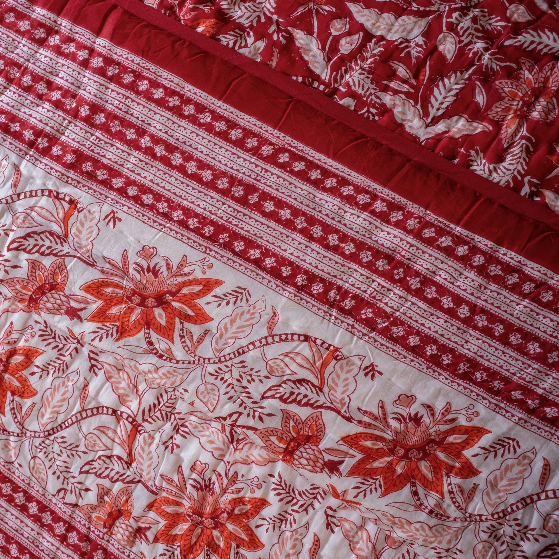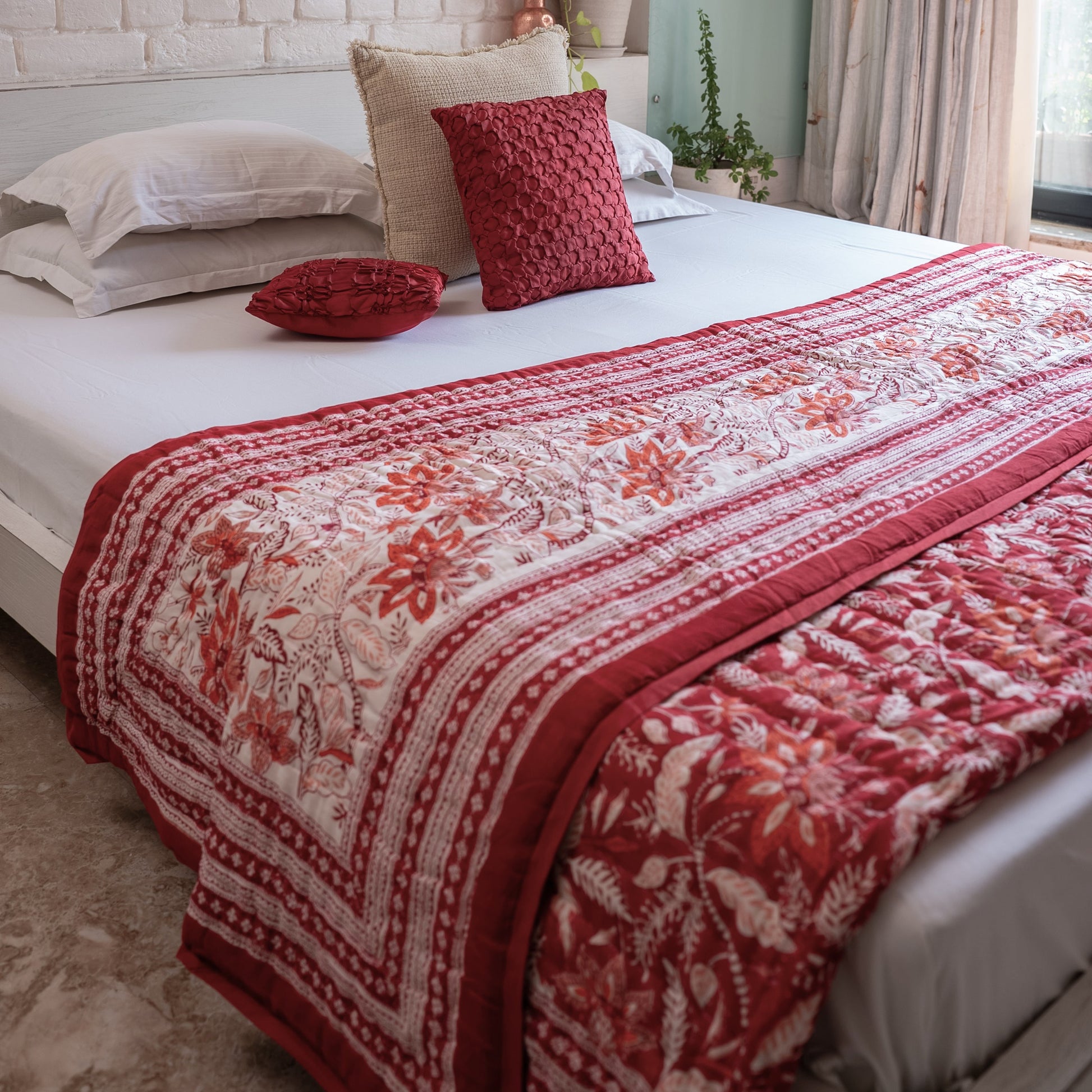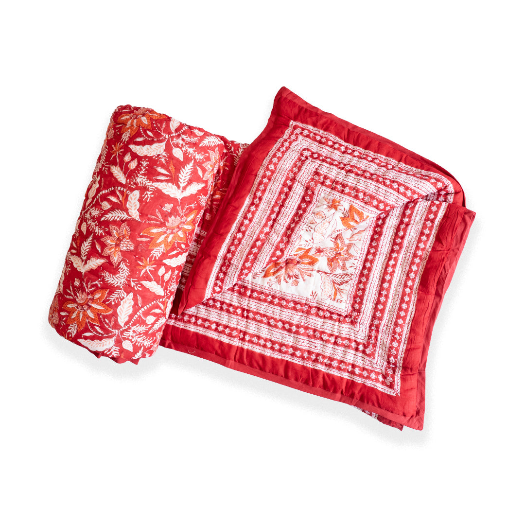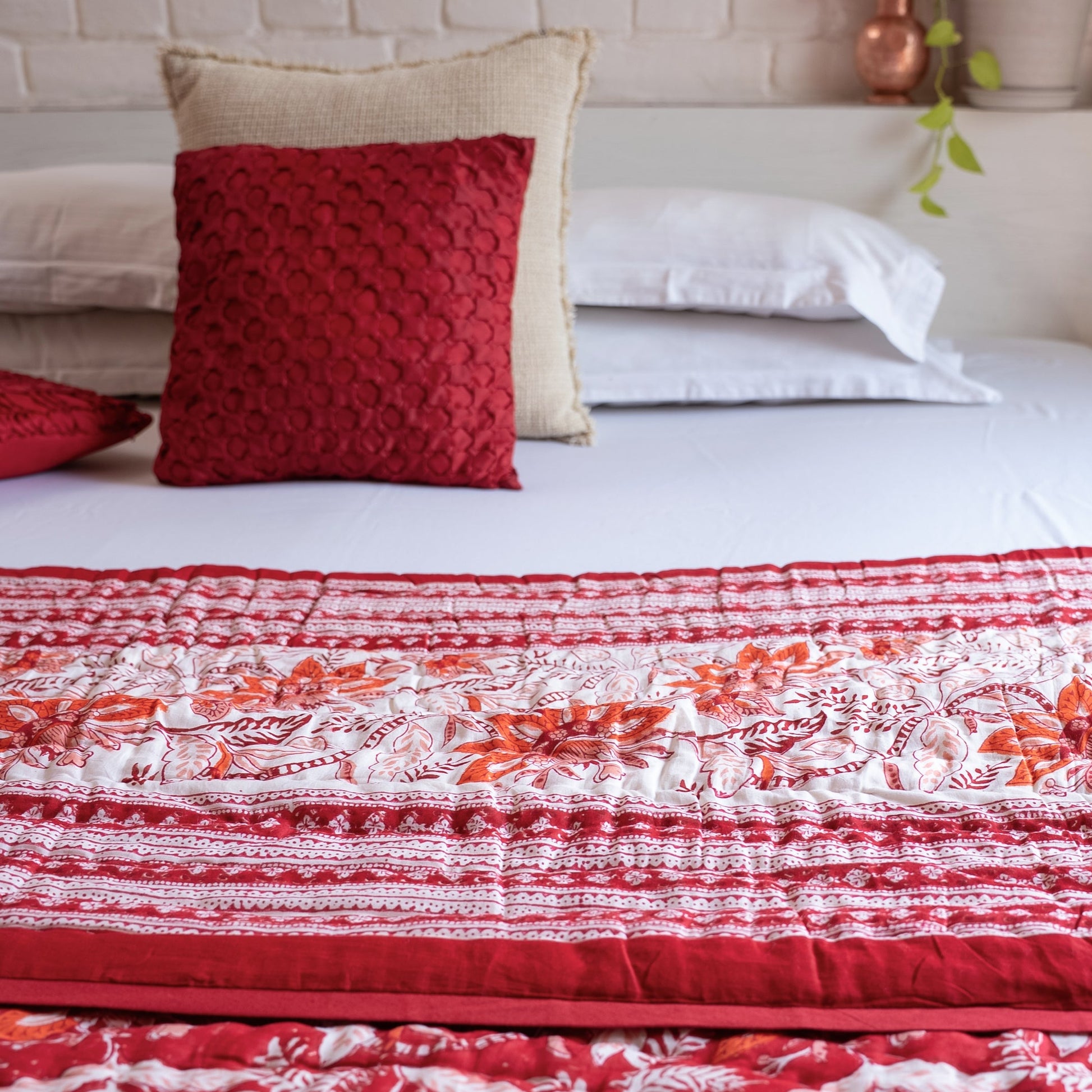 Bring timeless elegance Ruby Orchard Dohar, to your bedroom with this hand-block-printed, reversible quilt featuring delicate motifs in soothing tones. Made from cloud-soft cotton, it’s gentle on the skin and beautifully breathable—giving you comfort that makes you never want to leave the bed. With different prints on each side and fully home-washable care, it’s perfect for effortless, year-round use.